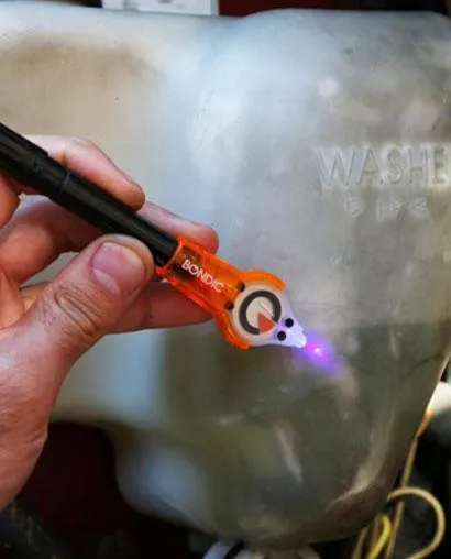 Promising review:"I had some tabs broken off of a fairing for a motorcycle. I used this glue and it is so strong now. I even ran a couple fat beads on either side just for good measure. This stuff is an easy to use clear gel that stays put while applying and cures in seconds with the light. What was wet is now dry and hard. You can handle right away and it looks great. Put stuff back together on the fly."
